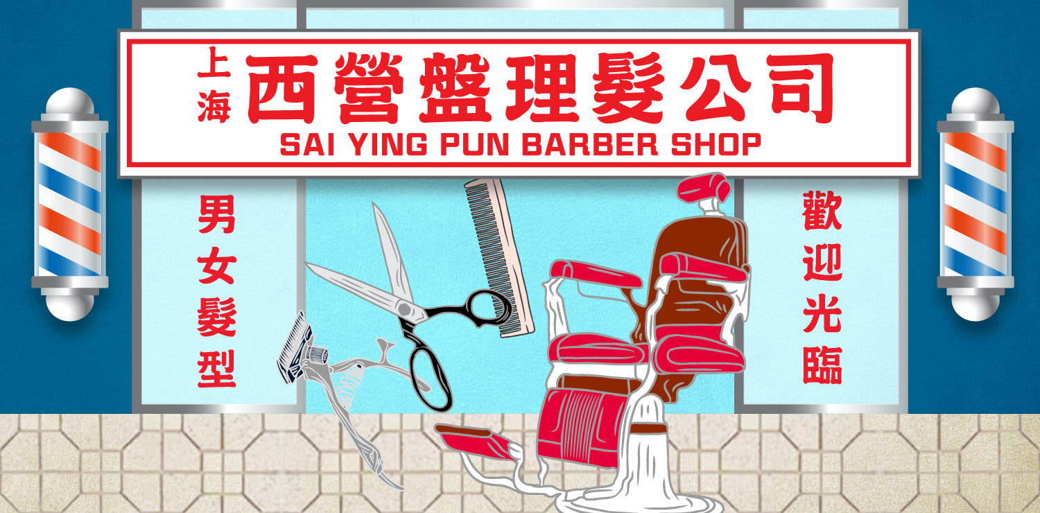 踏入港鐵西營盤站,您會見到一間經典的上海理髮廳,讓人彷彿穿梭回六、七十年代的老香港街頭。店外掛著紅白藍三色的旋轉燈筒,配搭「上海西營盤理髮公司」的懷舊招牌,承載著濃厚的歷史氣息。